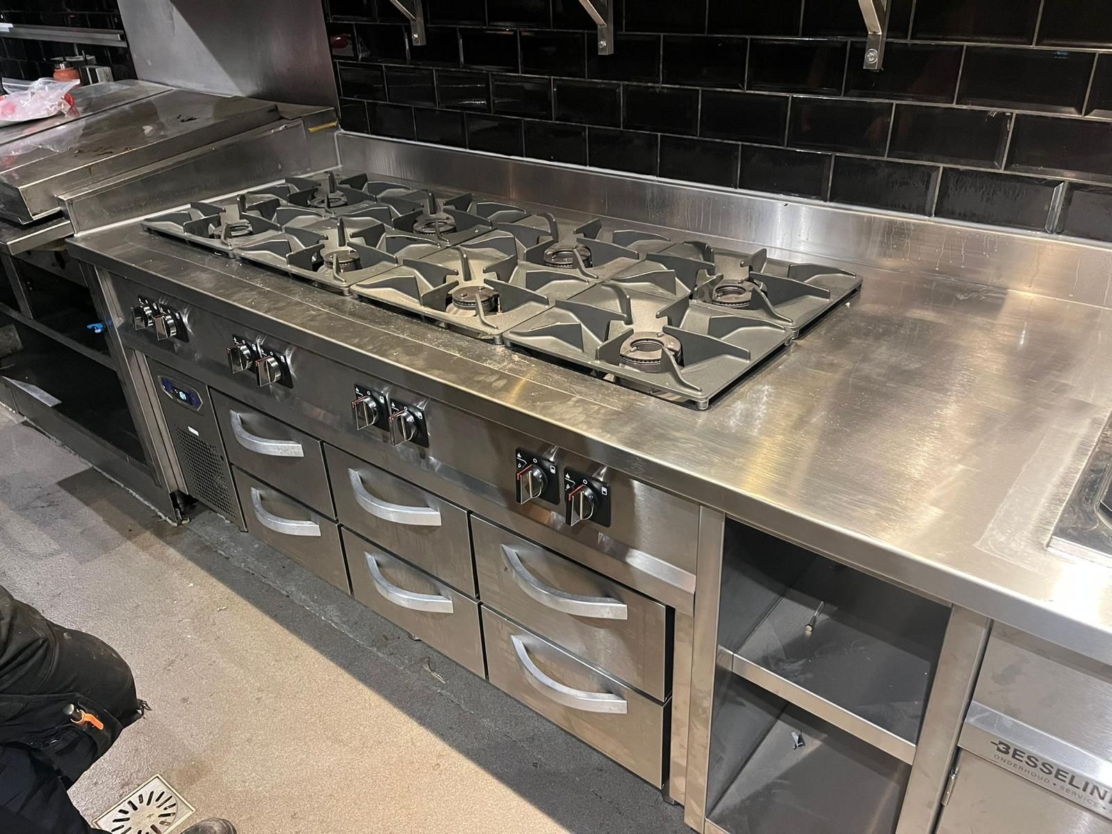 Hierin is onder andere een compleet nieuw 8 pits gasfornuis geplaatst waarop de mooiste steaks en rib eye’s gegrilld en gebakken kunnen worden. Ook hebben wij de bakwand voorzien van een dubbele Mareno drop-in friteuse voor alle bijgerechtjes.
